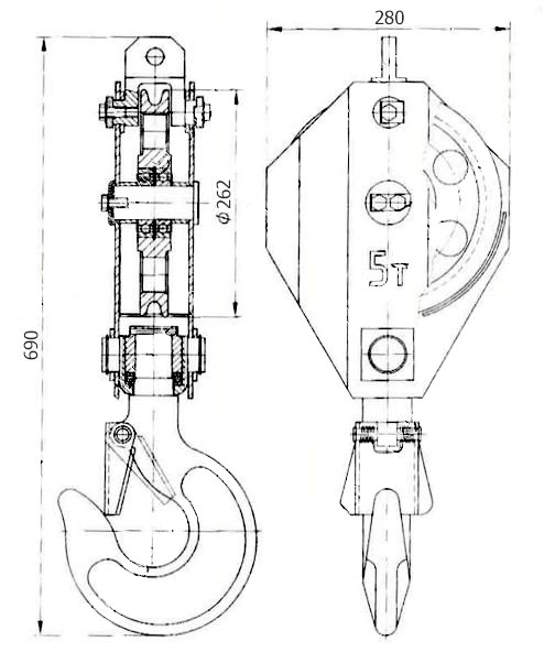 Узел состоит из двух щек, между которыми размещен канатный блок. Для подвешивания грузов используется крюк, оснащенный предохранительным замком. Опоры крюка выполнены на шариковых подшипниках. Благодаря этому, крюк легко вращается и обеспечивает равномерное перемещение груза.